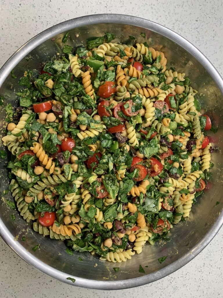 In a bowl, combine pasta, chickpeas, spinach, basil, garlic, bell pepper, olives, and the juicy tomatoes. - Add dressing:
