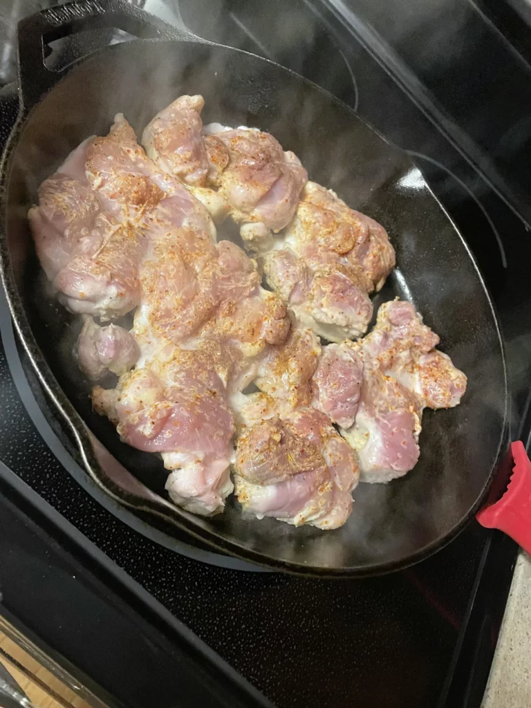 Pat the now skinless chicken thighs dry and season both sides with salt and pepper.