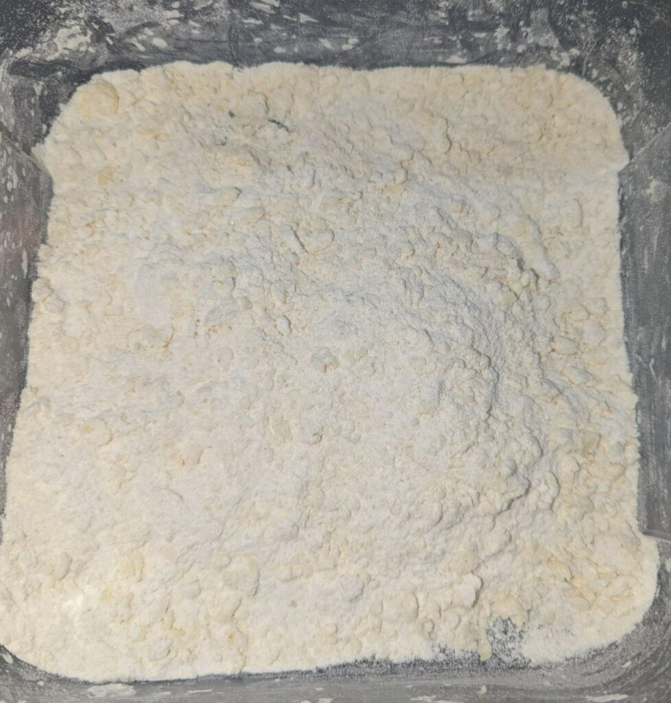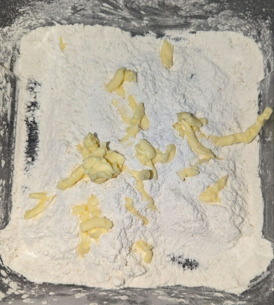 Make sure it’s almost frozen and cut into small cubes, then mix them in the flour, which gives a really good resulting texture for the biscuits.