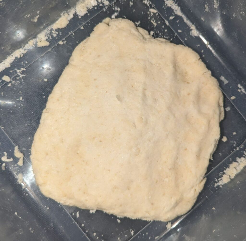 - Pat dough flat, fold over four times, and roll to 1-inch thickness.