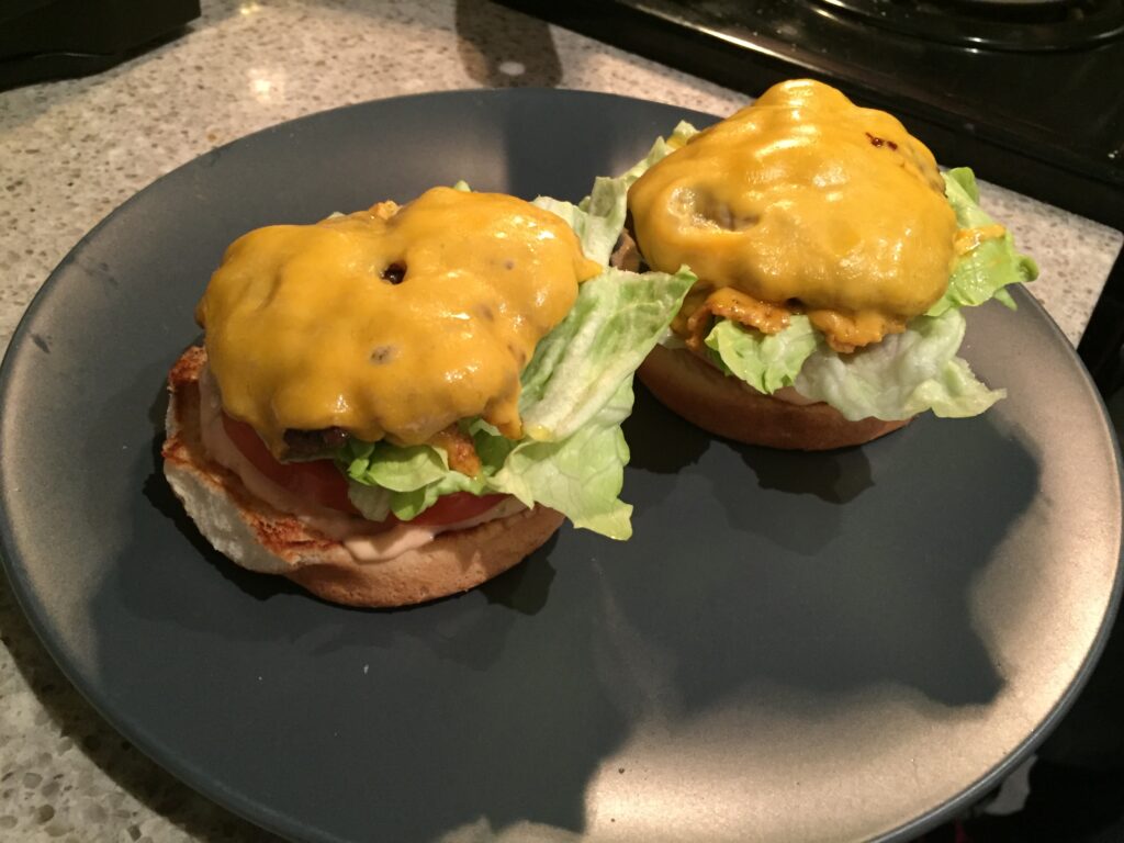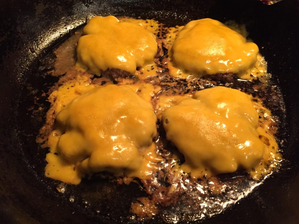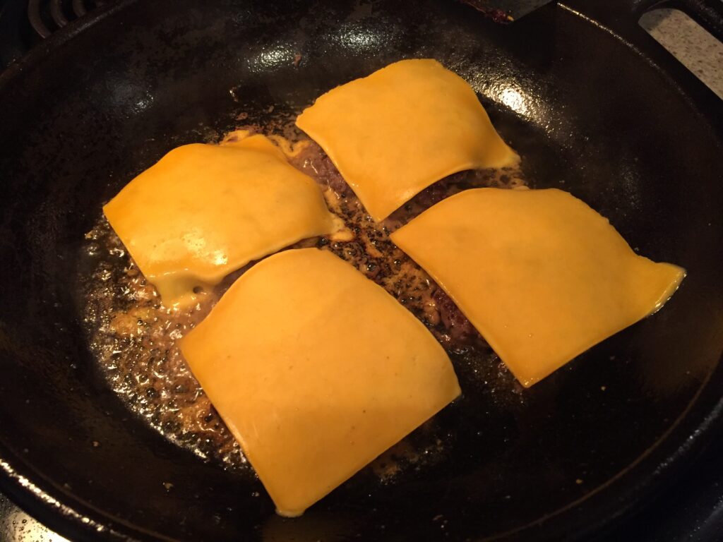 Melt cheddar cheese (two slices per burger) right on top so it oozes into every crevice.