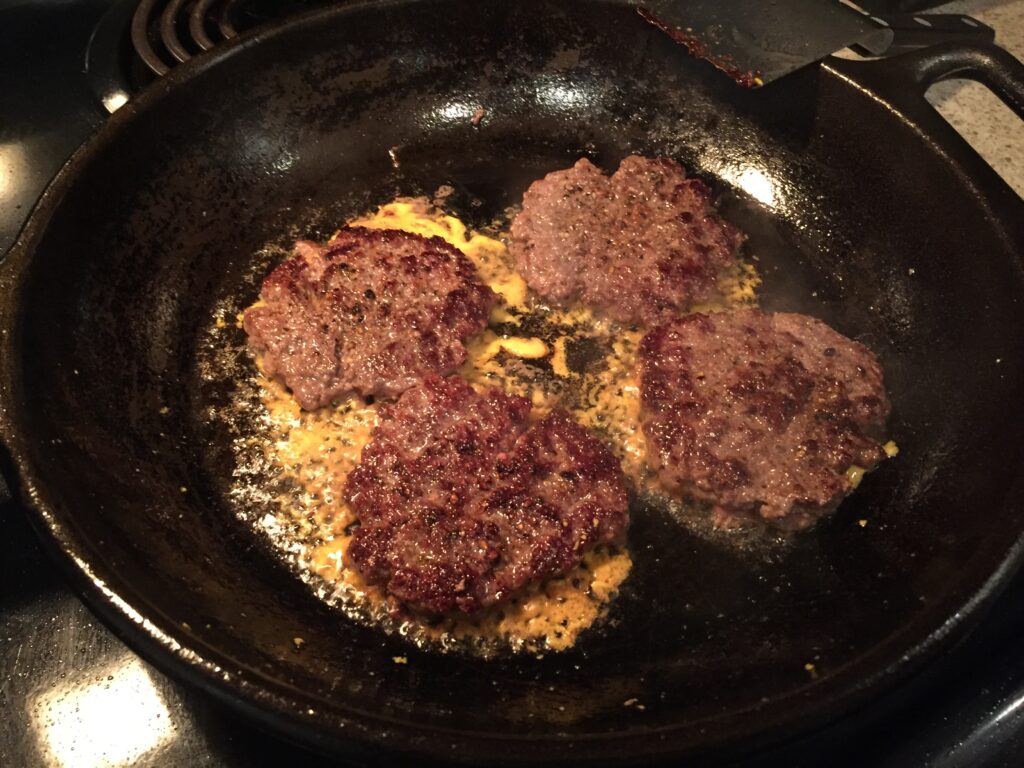 - Form 8 thin patties, season, cook. Spread mustard before flipping. Add cheese, stack 2 per burger.
