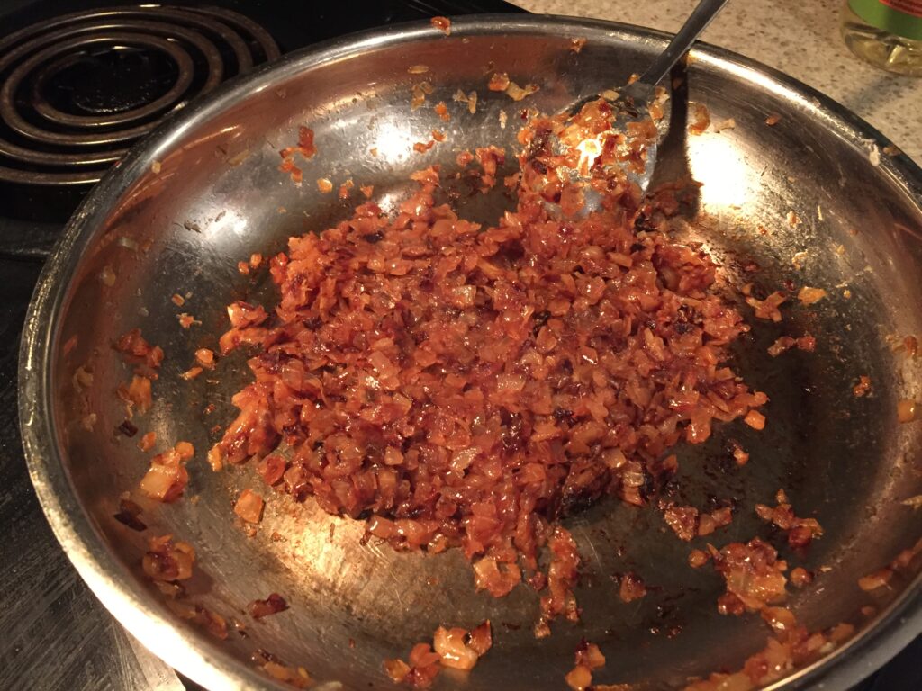 - Caramelize onions in butter + oil with salt, 20–25 mins.