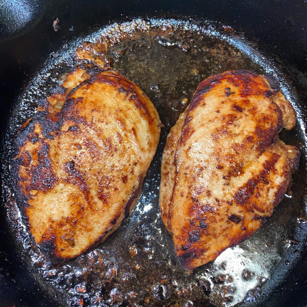 - Heat oil in a large skillet over medium-high heat. When the oil shimmers, add the chicken breasts and sear for 4–5 minutes per side until golden brown.