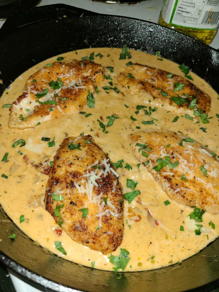 The original “Marry Me Chicken” is a chicken breast dish cooked in a creamy parmesan and sun-dried tomato sauce.