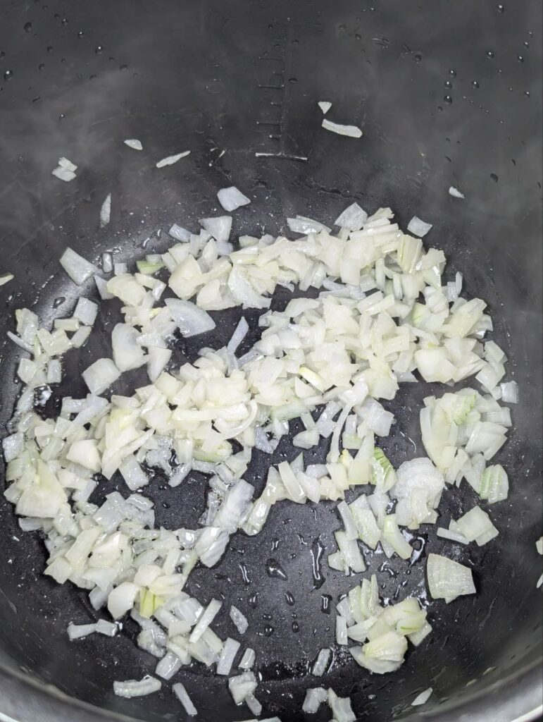 - Add diced onions (and bell pepper if using) and cook until translucent.