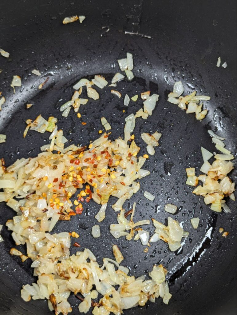 - Stir in grated garlic, cumin, and chili flakes; cook until fragrant.