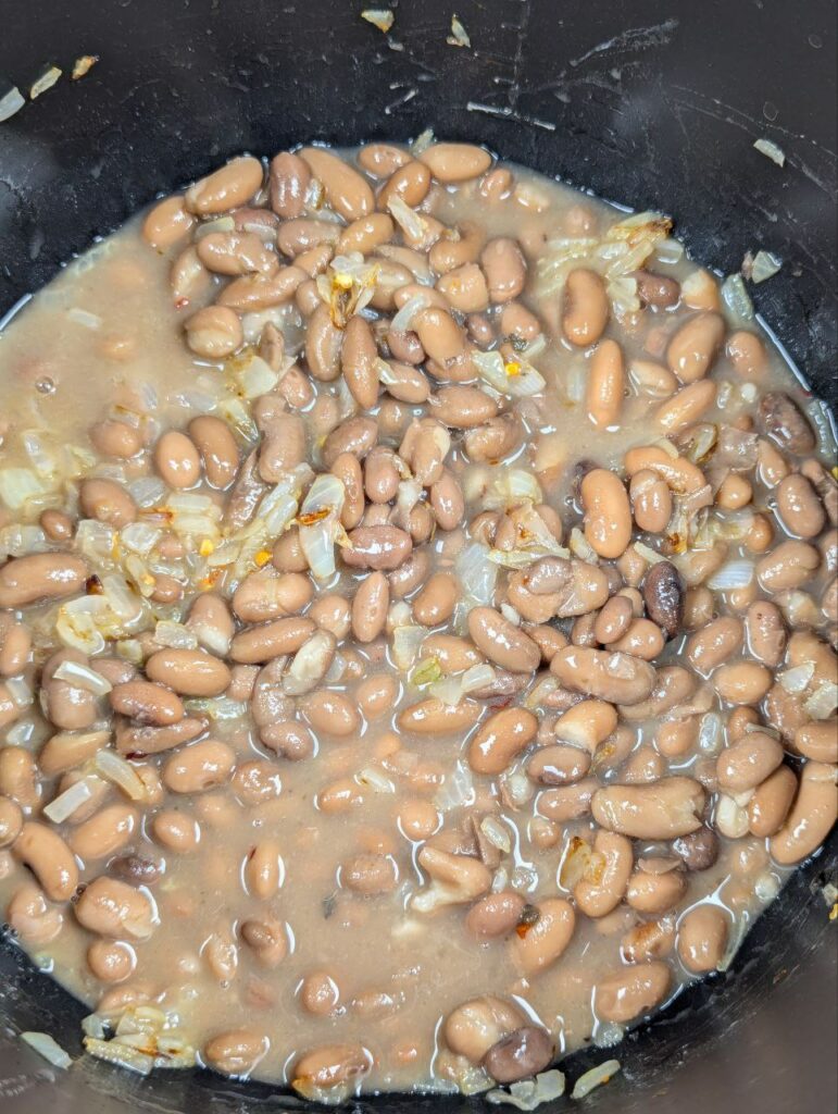 As for the onions, they are diced thin and they just mash into the beans; you won’t taste them.