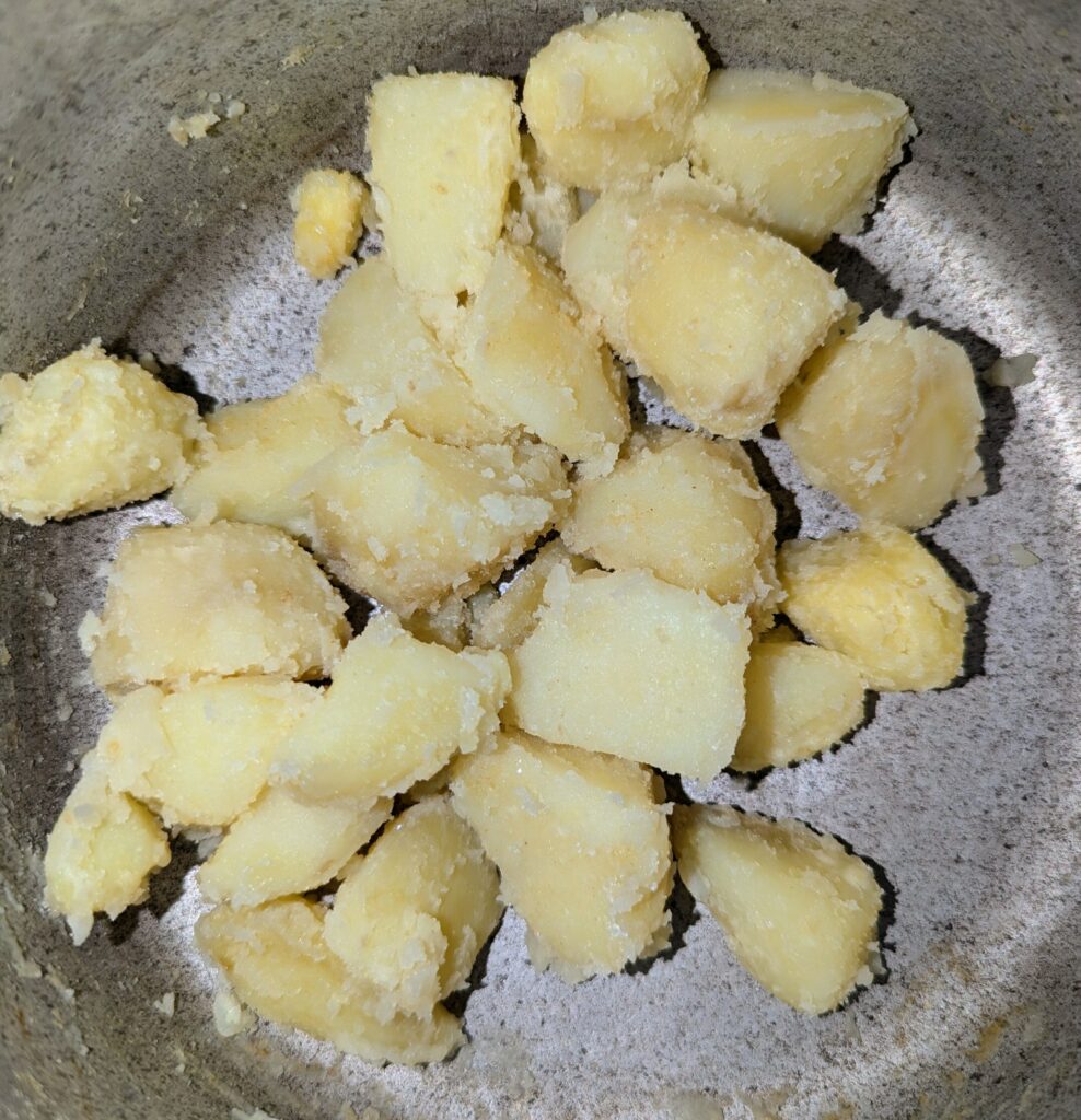 The potatoes are cut into bigger chunks here. I know, I know you may want smaller pieces because of the reduced cooktime…but those fall apart when boiling.