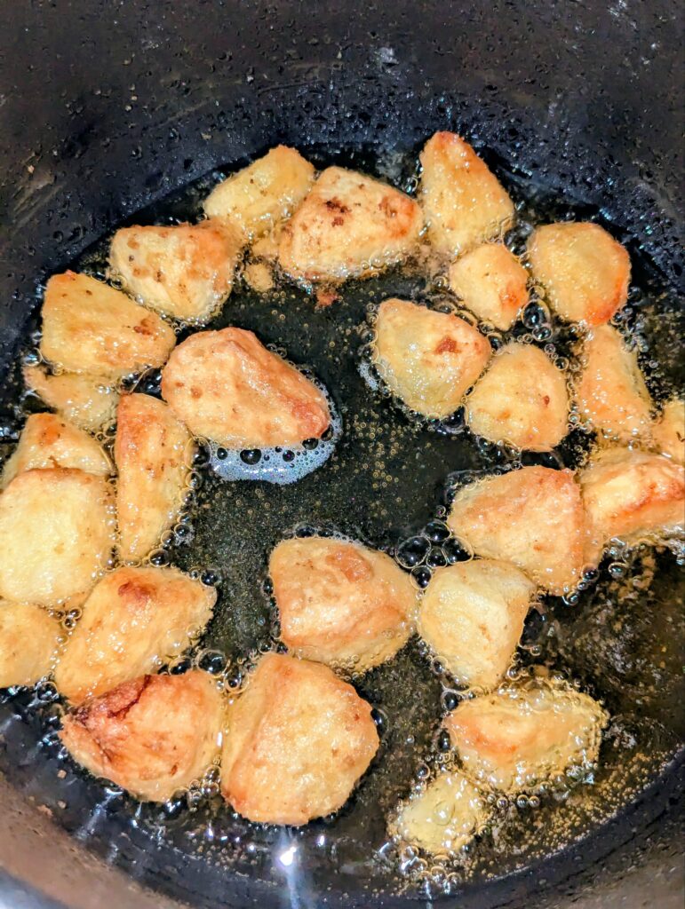 Also, going for smaller chunks, they tend to soak more oil in my opinion, since they crisp up and have holes inside where oil soaks up